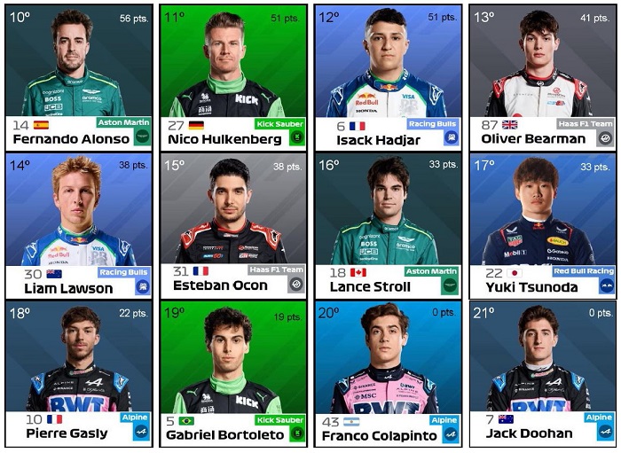 (*) Racing Bulls: 1 de Yuki Tsunoda (8º en China) y 3 de Isack Hadjar.